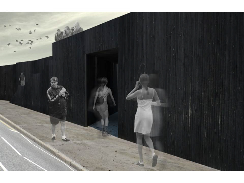 The second entrance is at pavement-level, allowing access for roller-bladers or wheel-chair users. This is the cut that runs through the business, creating a tunnel that transports you directly out on to the long jetty spanning the train tracks. Acting as a secret passage and provoking wonder, this entrance opens an unexpected vista for the visitors and another perspective of the site.